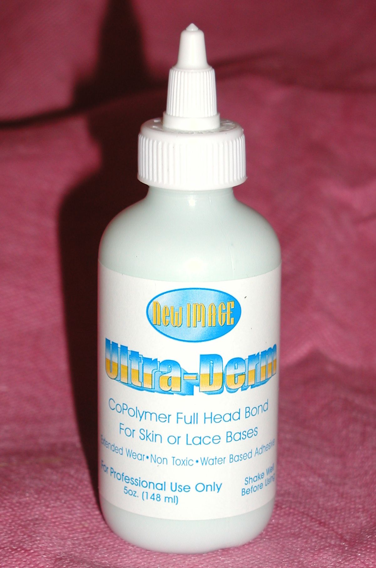 Ultra-Derm adhesive is a non toxic , non flamable water based application bond intended for use on all skin anbd lace base hair replacements. For best adhesision , it is reccomended that the scalp be totally clean of all bonding residue and scalp oils. allow each application to dry before applying the next coat.Dries completely clear, will hold from 2- 6 weeks. available in 1.3 oz. or 5.0 oz. bottle.